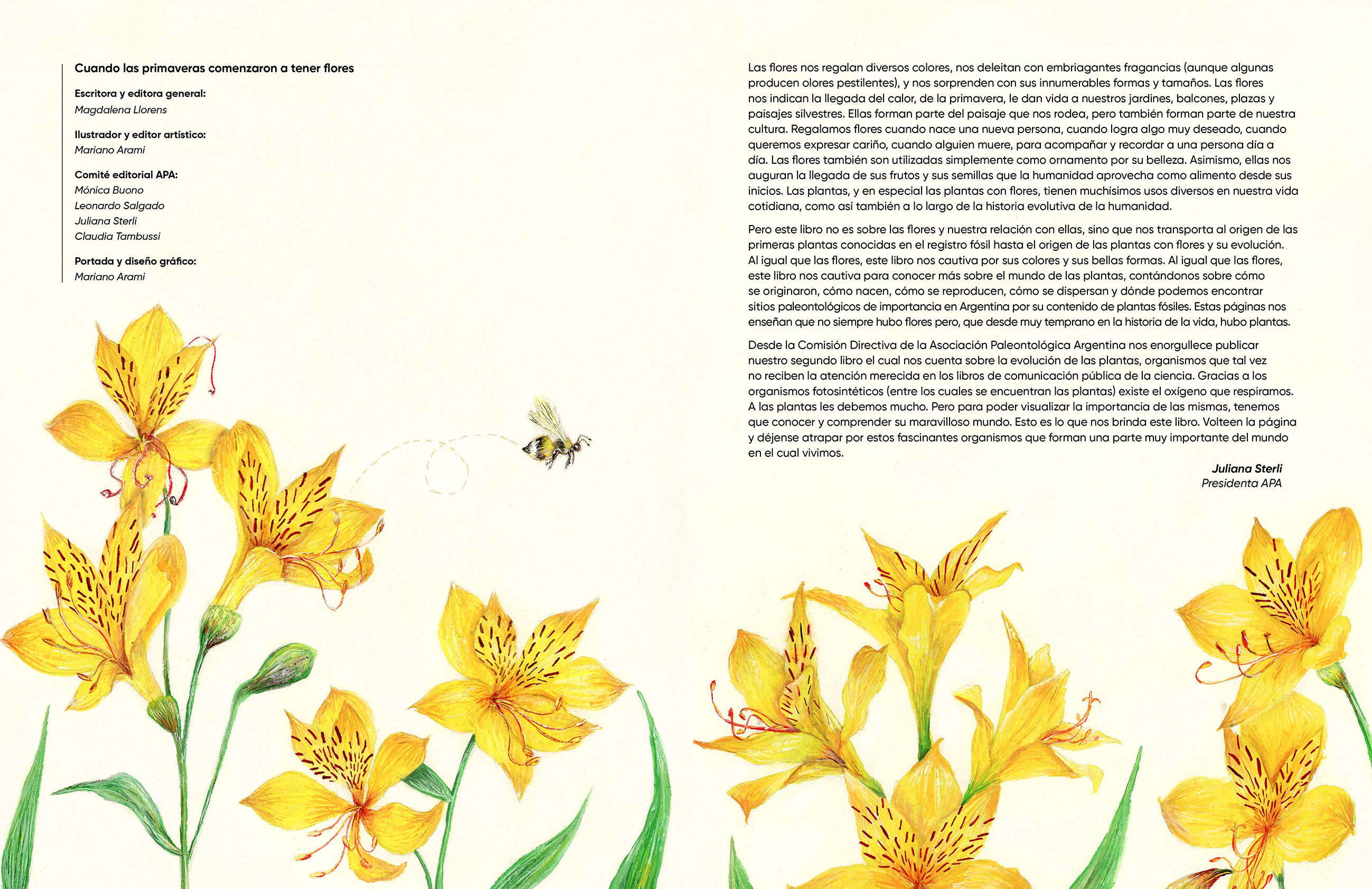 Las flores nos regalan diversos colores, nos deleitan con embriagantes fragancias (aunque algunas producen olores pestilentes), y nos sorprenden con sus innumerables formas y tamaños. Las flores nos indican la llegada del calor, de la primavera, le dan vida a nuestros jardines, balcones, plazas y paisajes silvestres. Ellas forman parte del paisaje que nos rodea, pero también forman parte de nuestra cultura. Regalamos flores cuando nace una nueva persona, cuando logra algo muy deseado, cuando queremos expresar cariño, cuando alguien muere, para acompañar y recordar a una persona día a día. Las flores también son utilizadas simplemente como ornamento por su belleza. Asimismo, ellas nos auguran la llegada de sus frutos y sus semillas que la humanidad aprovecha como alimento desde sus inicios. Las plantas, y en especial las plantas con flores, tienen muchísimos usos diversos en nuestra vida cotidiana, como así también a lo largo de la historia evolutiva de la humanidad. Pero este libro no es sobre las flores y nuestra relación con ellas, sino que nos transporta al origen de las primeras plantas conocidas en el registro fósil hasta el origen de las plantas con flores y su evolución. Al igual que las flores, este libro nos cautiva por sus colores y sus bellas formas. Al igual que las flores, este libro nos cautiva para conocer más sobre el mundo de las plantas, contándonos sobre cómo se originaron, cómo nacen, cómo se reproducen, cómo se dispersan y dónde podemos encontrar sitios paleontológicos de importancia en Argentina por su contenido de plantas fósiles. Estas páginas nos enseñan que no siempre hubo flores pero, que desde muy temprano en la historia de la vida, hubo plantas. Desde la Comisión Directiva de la Asociación Paleontológica Argentina nos enorgullece publicar nuestro segundo libro el cual nos cuenta sobre la evolución de las plantas, organismos que tal vez no reciben la atención merecida en los libros de comunicación pública de la ciencia. Gracias a los organismos fotosintéticos (entre los cuales se encuentran las plantas) existe el oxígeno que respiramos. A las plantas les debemos mucho. Pero para poder visualizar la importancia de las mismas, tenemos que conocer y comprender su maravilloso mundo. Esto es lo que nos brinda este libro. Volteen la página y déjense atrapar por estos fascinantes organismos que forman una parte muy importante del mundo en el cual vivimos.